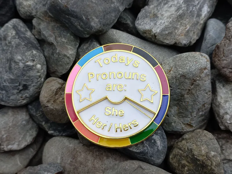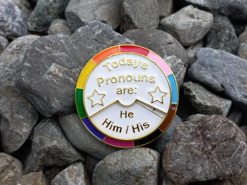 Wear your pride with this enamel badge which displays your pronouns. The front disc can be rotated around to display the different options. It measures 5cm tall and 5cm at it's widest. The badge is secured with two bars and two butterfly clips on the reverse.