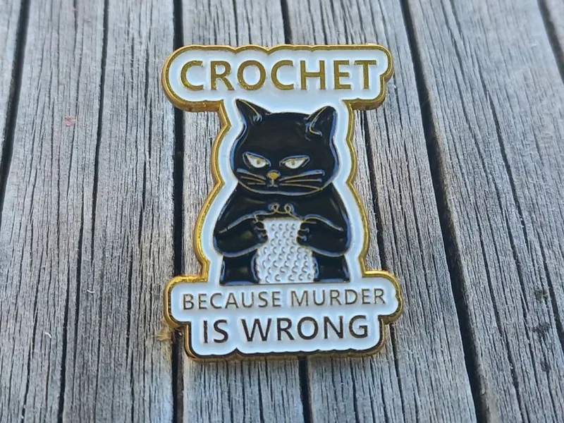 For the cat loving crocheter in your life... An enamel badge featuring a black cat and the words "Crochet Because Murder is Wrong" The badge measures approx 3.0cm tall and 2.5cm at it's widest. The badge is secured with a single bar and rubber stopper on the reverse.