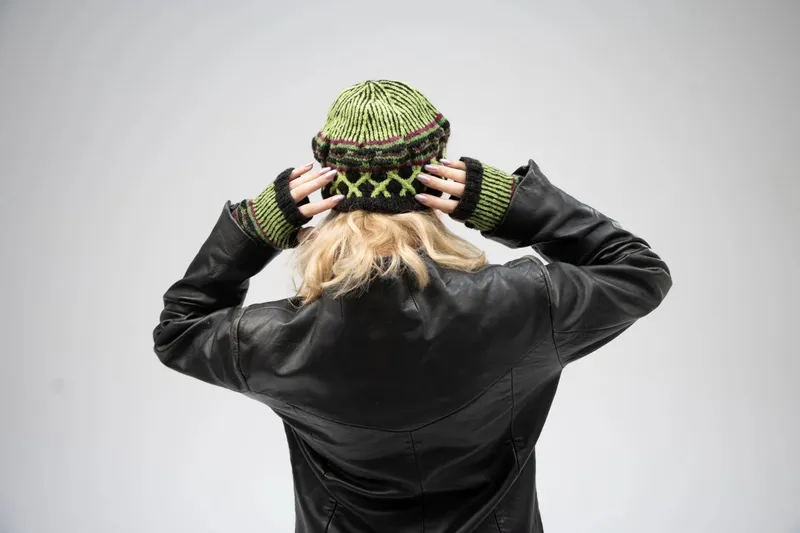 LOUISE MOSSOM, PIXIE LOU FELT: Northern Lights beanie & fingerless mitts.