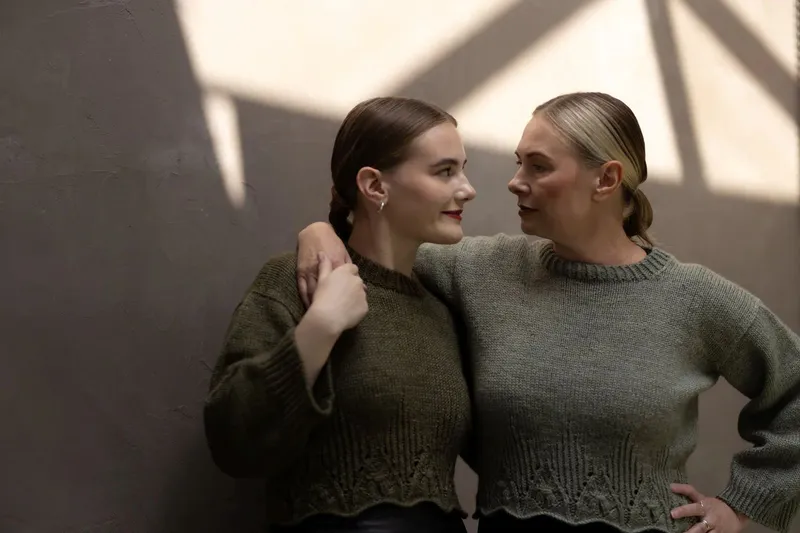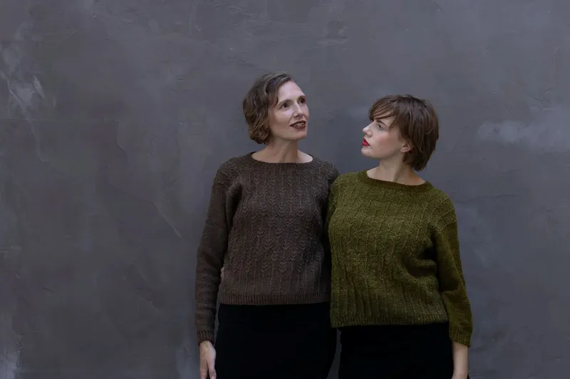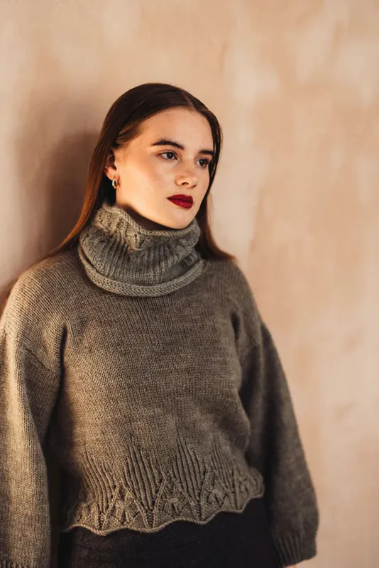 KATT WEAVER, HEATHER AND HOPS Hairst Jumper: lace details and twisted rib around the hem make an elegant jumper, with matching cowl and scarf designs. Designed with Zakami Yarns Aran wool.