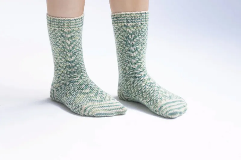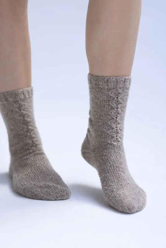 SARA WOLF Diamond Twist Socks: inspired by a small knitted fragment found with the Gunnister man in Shetland. Designed with Uist Wool Canach, Westfield Croft Shetland or Whistlebare Cuthbert’s Sock yarn.
