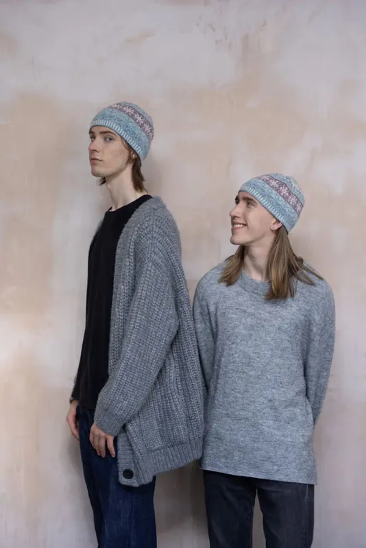 LOUISE MOSSOM Sma’ Glen Beanie Hat: inspired by the magical purple sky that precedes snow. Designed with Jamieson’s of Shetland Spindrift wool.