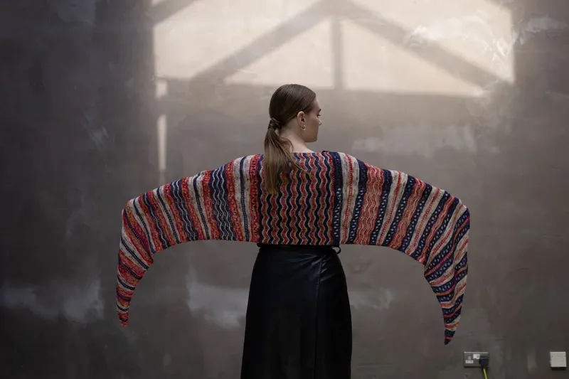 MERRIAN HOLLAND, MEZZACRAFT Droman Hat: peaks and troughs are accentuated with colour, designed to use up small quantities of DK yarn. Designed for Ripples Crafts yarn or Jamieson’s of Shetland DK wool.