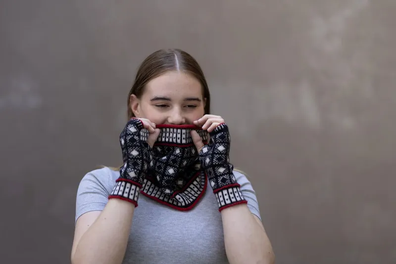RUTH ROBINSON Charles III Sanquhar Mitts and Cowl: a new pattern based on historic motifs, created for the Coronation of the new King. Designed with Wee County Yarns Kinross 4 ply wool.