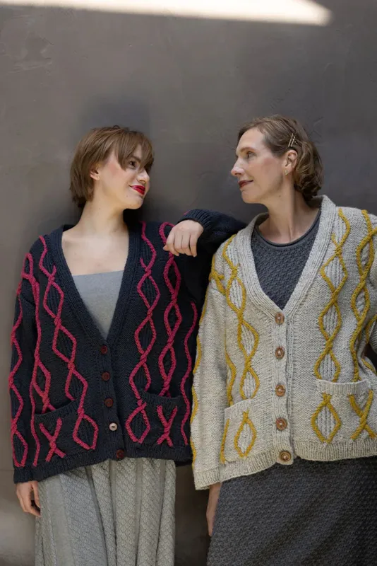 SYLVIA WATTS-CHERRY Coorie Cardigan: a snuggly cardigan featuring cables framed with intarsia colourwork. Designed with Iona Wool Aran weight wool.