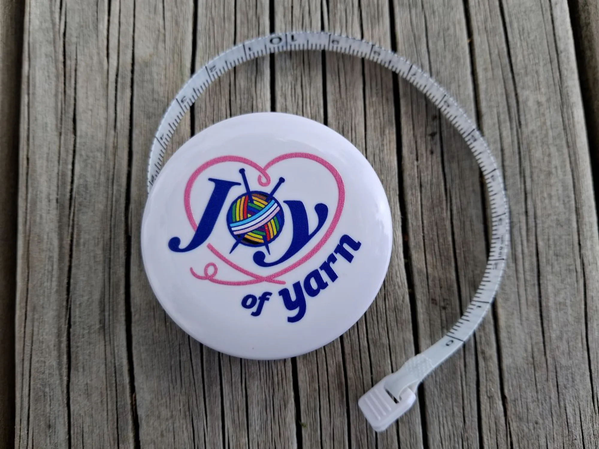 Our own branded, retractable measuring tape. Contained in a round plastic case the tape measures to 60 inches on one side and 150cm on the other. Just press the button on the back of the case to retract the tape after using.