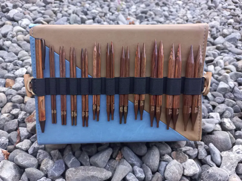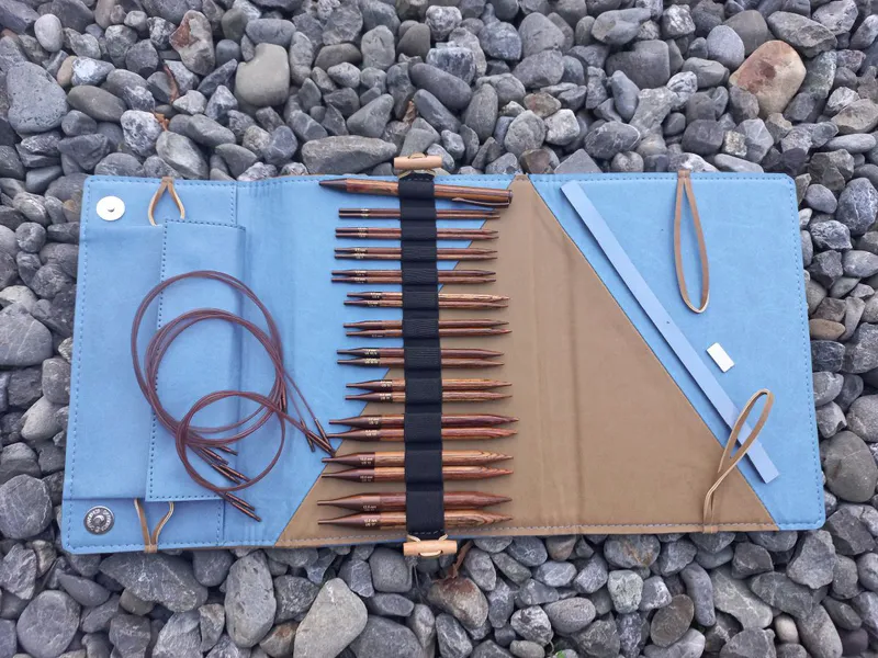 The case is made from imitation leather with a denim and beige finish and includes a chart keeper. It’s perfect for those knitters who like to have a printed pattern in front of them, instead of an electronic screen.