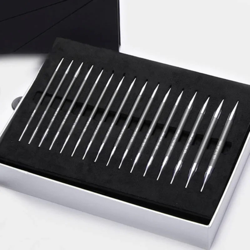This set of Karbonz Interchangeable Circular Needles is the perfect blend of strength and elegance. Crafted of lightweight and super strong carbon fiber, 8 sets of sleek interchangeable needle tips are laser marked with sizes. The beautifully honed tips ensure smooth knitting with any and all yarns. The set also includes 4 black nylon coated stainless steel swivel cables. A complete set of accessories comes packaged in a lovely silver pouch. All is contained in a sophisticated black and grey box to complete the look of refined sophistication.