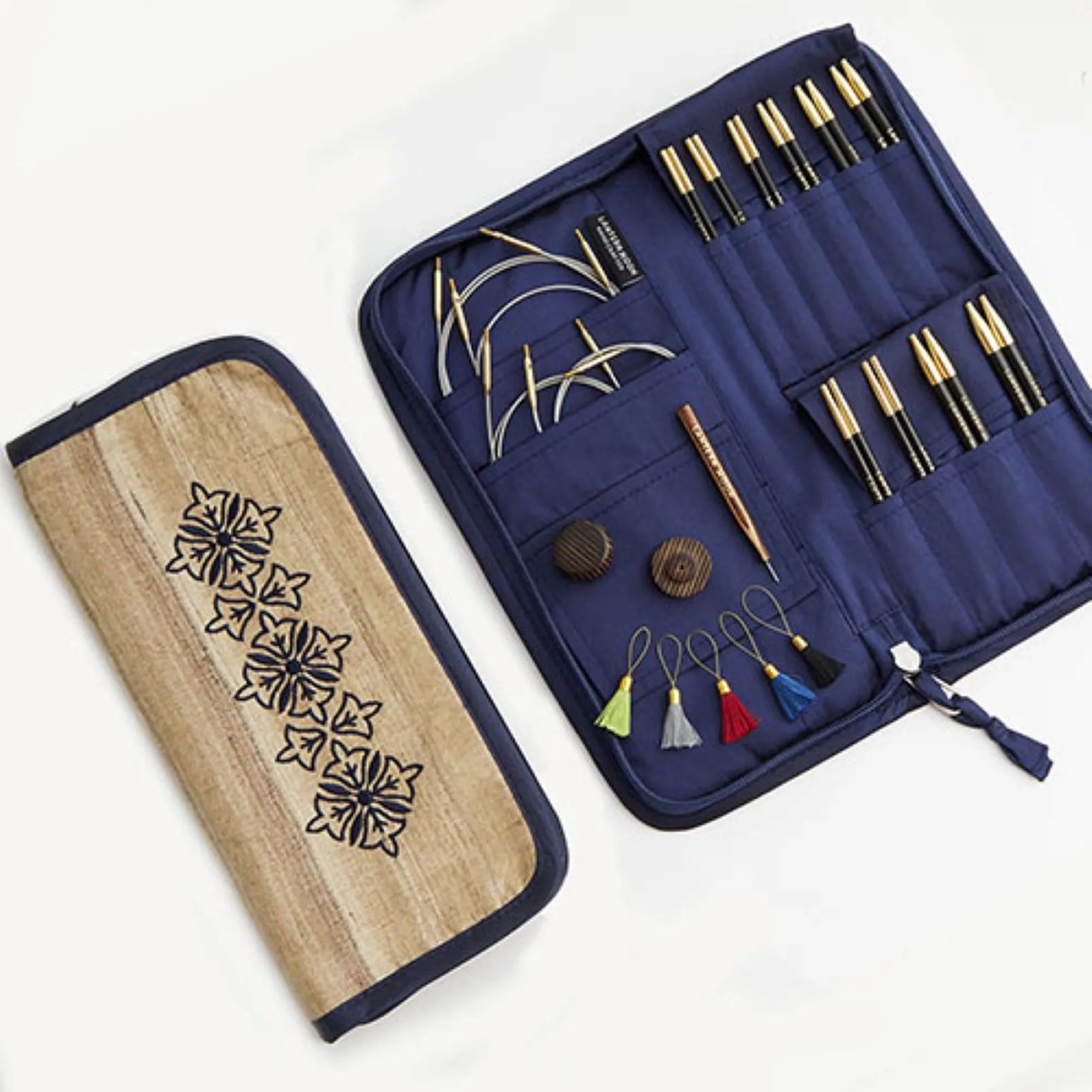 The case is made with Khadi silk, a historically significant Indian material. The exterior features lovely floral motif embroidery. Inside there is room for multiple interchangeable needle tips and cords. The zippered case keeps all contents safely stored and organized. These needle sets are designed by artisans for generations of use by skilled knitters.