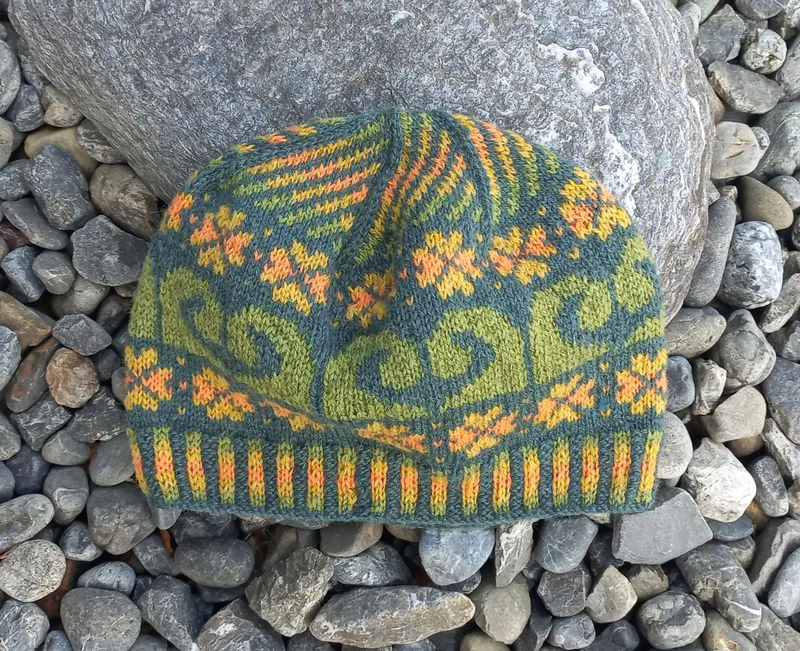 The design conveys through stitches, a mix of Shetland and New Zealand inspired motifs. The flower represents the monkey flower, which became unique to Shetland upon its introduction. The koru represents new beginnings and seems very appropriate for the first muster. The grouping of two koru together forms a heart as well as waves crashing against the Wairarapa shore. The negative space between the waves represents a bird diving into the ocean to feed. The crown of the beanie represents everyone coming together in a shared interest, in this case our love of wool.