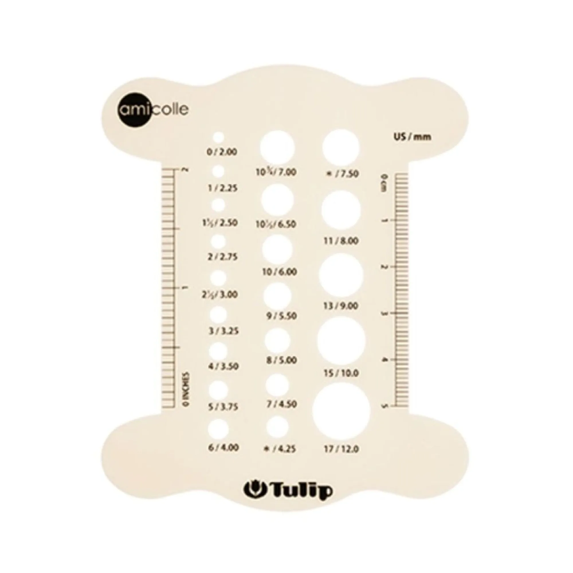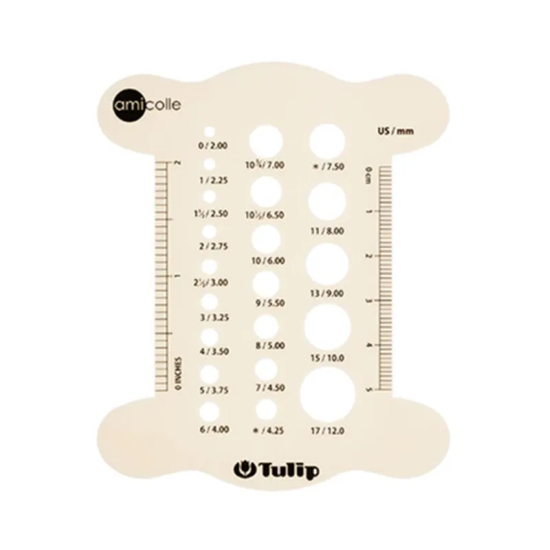Use this Tulip Knitting Needle Gauge to easily check the size of your needles. This gauge features 21 needle holes to easily check the size of a needle. The sides of the gauge also feature small rulers. One measures in inches and the other in centimeters. Also, the shape of the gauge allows it to be used as a wool bobbin.